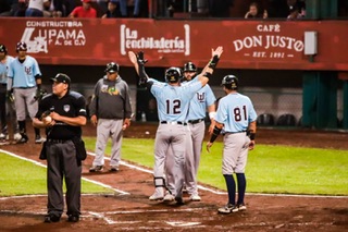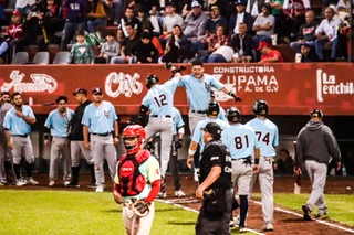 Xalapa, Ver. 14 de octubre de 2023.- Ataque de nueve carreras en el quinto episodio orquestado por jonrón con los senderos congestionados de Luis Medina, encaminó al combinado de Pericos-Algodoneros-Olmecas al triunfo por pizarra de 14-6 sobre los Chileros de Jalapa en el primer juego de la serie.