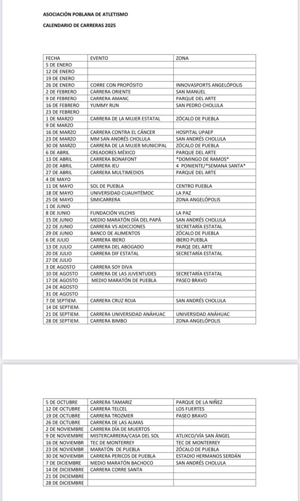 Con el objetivo de que exista orden y calendarización adecuada, dándole a cada carrera su debido espacio, es como se presentó esta agenda 2025, una de las más completas desde que regresaron las competencias en el 2022 y que se elevó la práctica del running en Puebla.