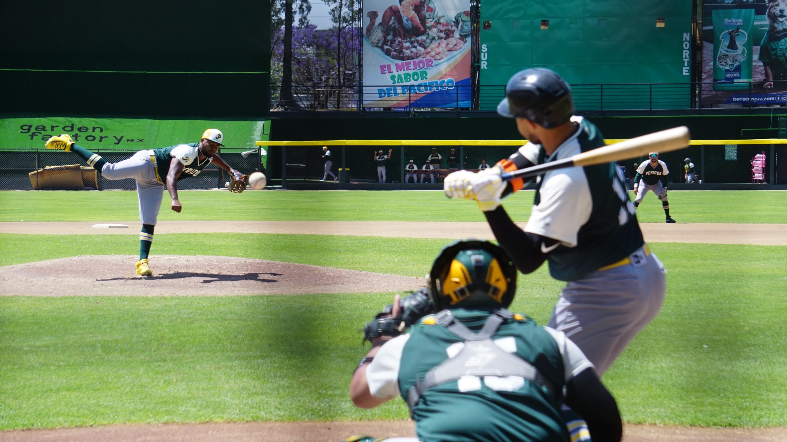 Desde ahí, el manager Russell Vázquez, su coach de banca Héctor Estrada y su staff de trabajo, observa el tercer juego simulado de la organización verde, en su décimo cuarto día de pretemporada de cara a la temporada 2025 de la Liga Mexicana de Beisbol de Verano que arranca el jueves 17 de abril con el duelo entre los campeones Diablos y los Leones de Yucatán.