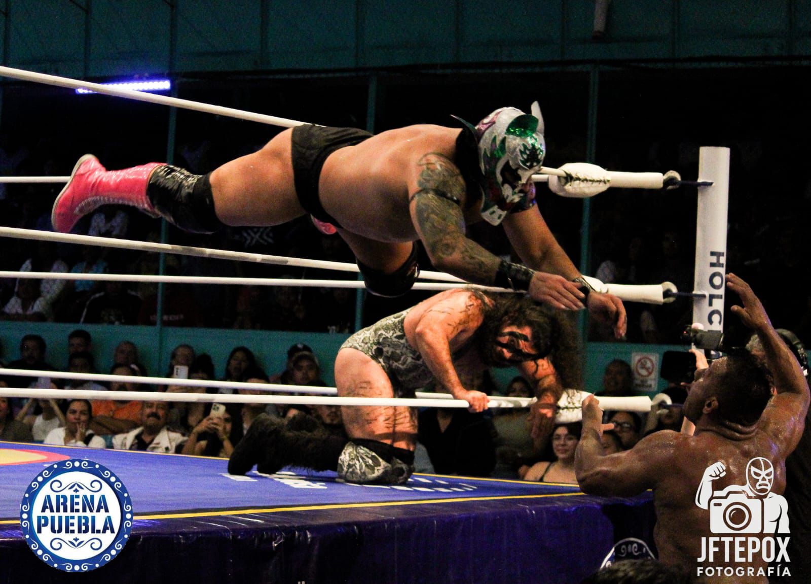 CIUDAD DE PUEBLA.- En la batalla súper estelar de la tradicional función de lunes por la noche en la Arena Puebla, gracias a una “colmillada” de Valiente, guio a los rufianes, Volador Jr. y Bárbaro Cavernario a la victoria por descalificación sobre Místico, Esfinge y Atlantis Jr.