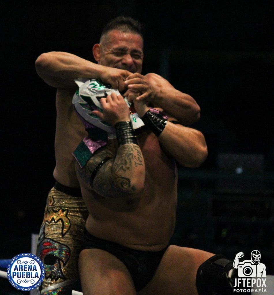 En lo que sin lugar a dudas fue la mejor lucha de la noche, “La Fuerza Poblana”, Stigma, Arkalis, Xelhua y Rayo Metálico ganaron por descalificación ante Kraneo, Infarto y los Calavera Jr. I y II.