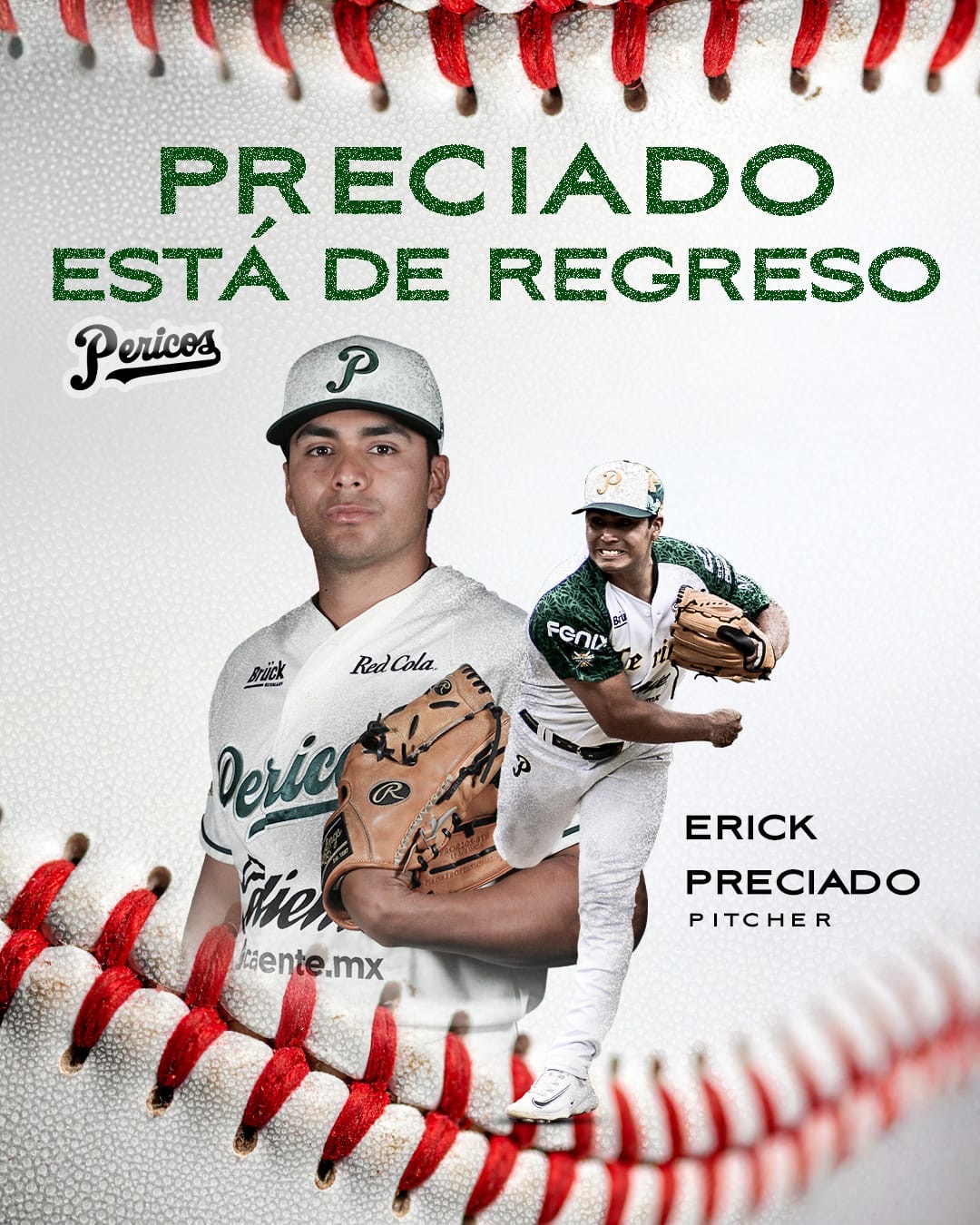 Erick Preciado nació el 25 de junio de 1996. Pitcher surgido de los Pericos de Puebla. Debutó en LMB en el 2021 y tuvo una gran presentación al relevar en 23 juegos y terminar con foja de 2-0. Ese mismo año, reportó en el invierno con los Charros de Jalisco. El año pasado tuvo acción en 12 cotejos, en los cuales no tuvo decisión. Esta será su sexta temporada con los emplumados. En total, en los cinco años anteriores, ha participado en 124 encuentros, tiene marca de 4-4 con efectividad de 5.63 en 123 entradas lanzadas. Fue parte del campeonato del 2023, en esa postemporada tuvo 11 relevos con marca de 1-0 y efectividad de 2.84, el triunfo que obtuvo fue el que le dio el título a los Pericos de Puebla, en el sexto juego de la Serie del Rey, al relevar una entrada sin daño alguno. El reciente invierno jugó con Tucson y fue uno de los relevos con más actividad de su novena al sumar más de 30 cotejos. En la Liga Mexicana del Pacífico suma ya 109 juegos jugados