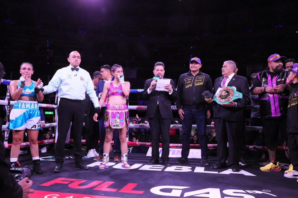 Los tres jueces vieron ganadora a la poblana, dos de ellos 100-90 y el tercero 99-91, para que así el réferi levantara la mano de la nueva monarca universal interina que, crecida por su triunfo, retó a la cuatro veces monarca mundial, Mariana “Barbie” Juárez a una pelea en la ciudad de Puebla.