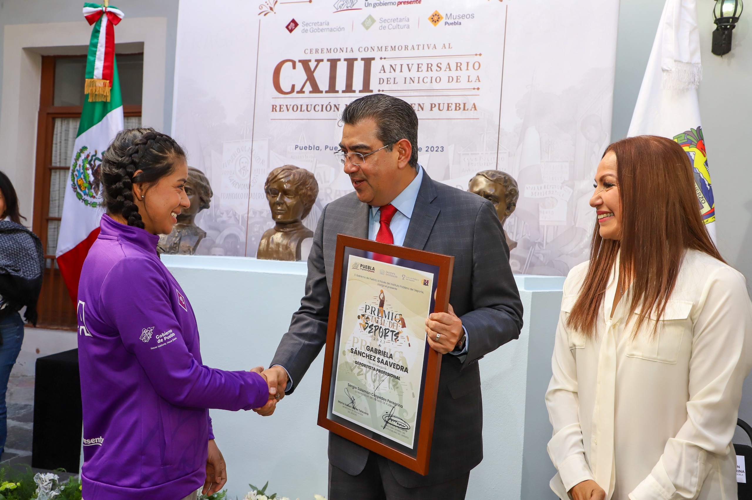 Durante la ceremonia en la que hubo una escenificación del inicio de la Revolución Mexicana, Sergio Salomón también entregó reconocimientos y medallas a las y los ganadores del Premio Estatal del Deporte 2023. Al respecto, la directora general del Instituto Poblano del Deporte (INPODE), Yadira Lira Navarro destacó que hoy la entidad cuenta con un…